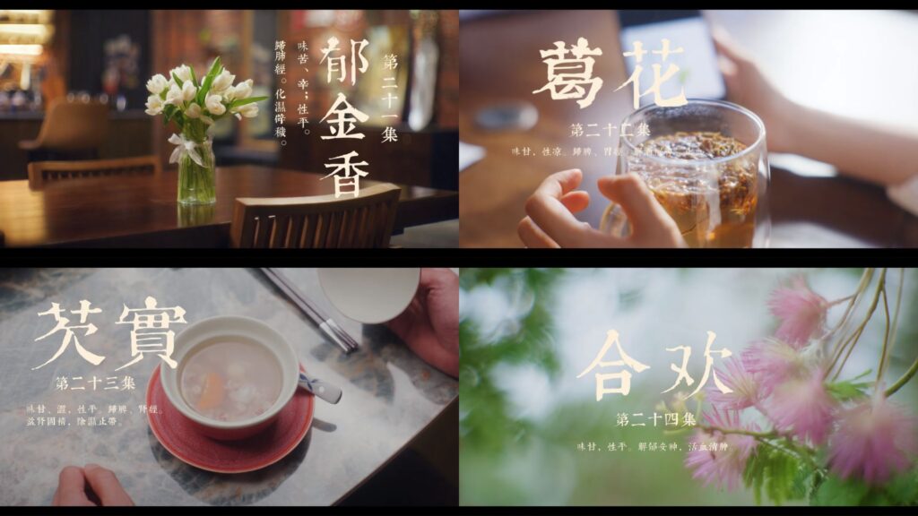 | 23 | 《芡實》 | 味甘、澀,性平。 歸脾、腎經。益腎固精,除濕止帶。 | 蘇葉一家人與惜凡聚餐,蘇葉特地點了芡實湯。 這是蘇葉小時候,媽媽常煮給他喝的湯。 |