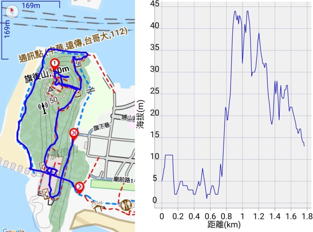 我是從西子灣搭乘渡輪到旗津,先循著旗津老街走到沙灘逛一逛,再沿著指標走往星空隧道,一路走到旗后燈塔與旗后砲台。本次路徑總計1.76公里,累計爬升56公尺,累計下降44公尺,總計34分鐘。